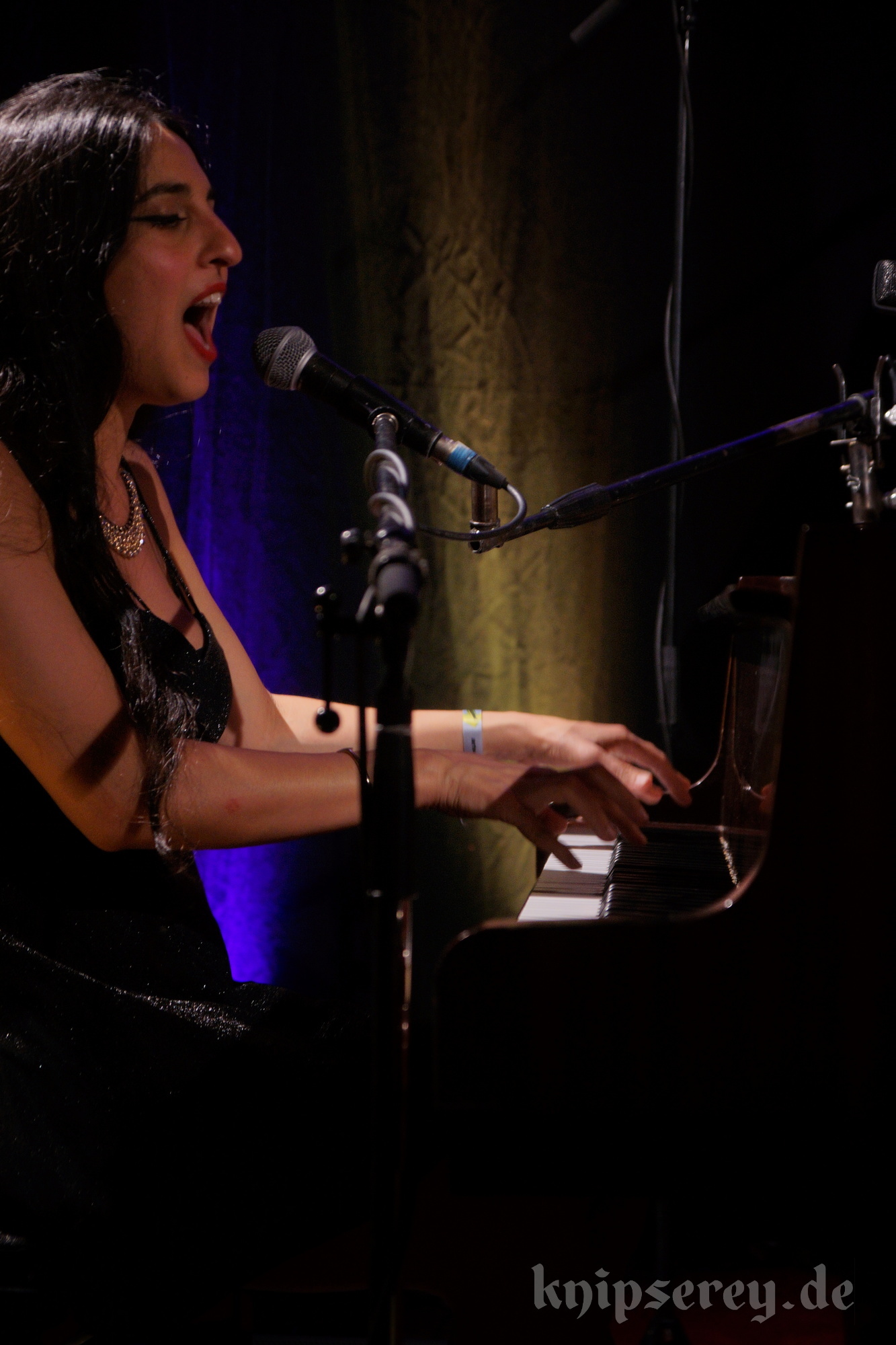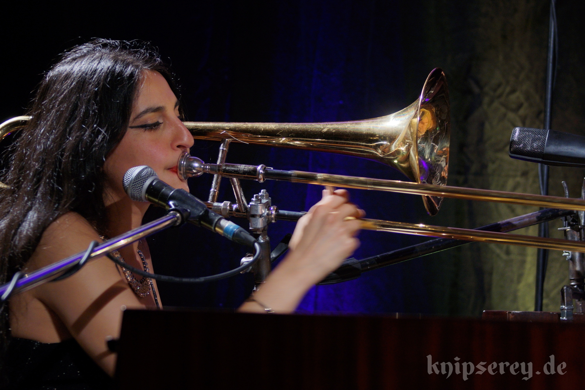 Hier gab es Vocal-Jazz aus Israel von Noam Vazana – sie spielte gleichzeitig(!) Flügel und Posaune und wurde begleitet von dem niederländischen Streich-Quartett Quintessences.